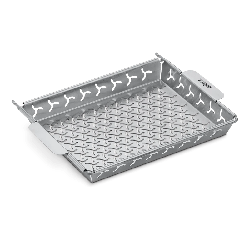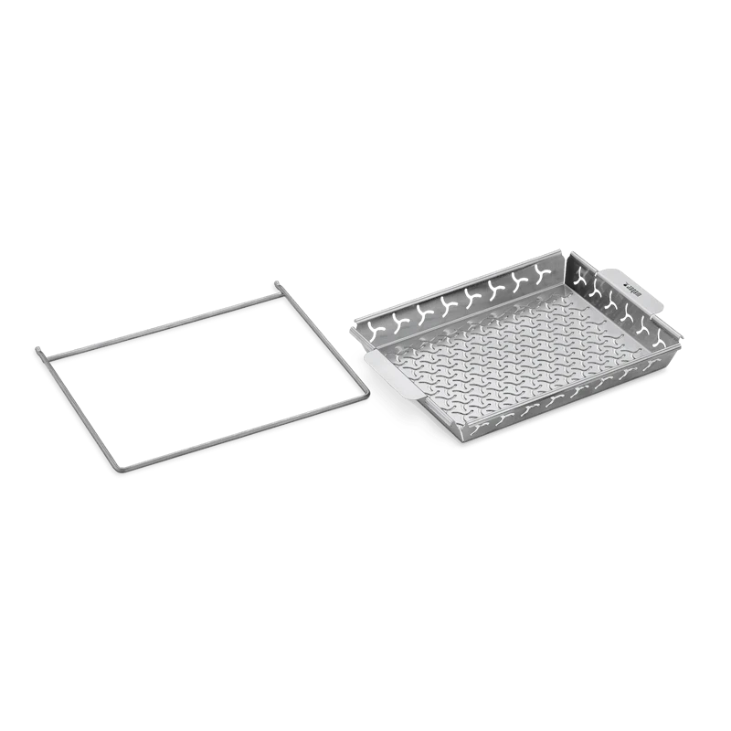 Gril perfect gekruide groenten, of kleine gerechtjes, in de Elevations grillkorfset terwijl het hoofdgerecht eronder geroosterd wordt. De korf valt in een onderstel dat in het gelaagde grillrooster past waardoor u meer grillcapaciteit creëert.